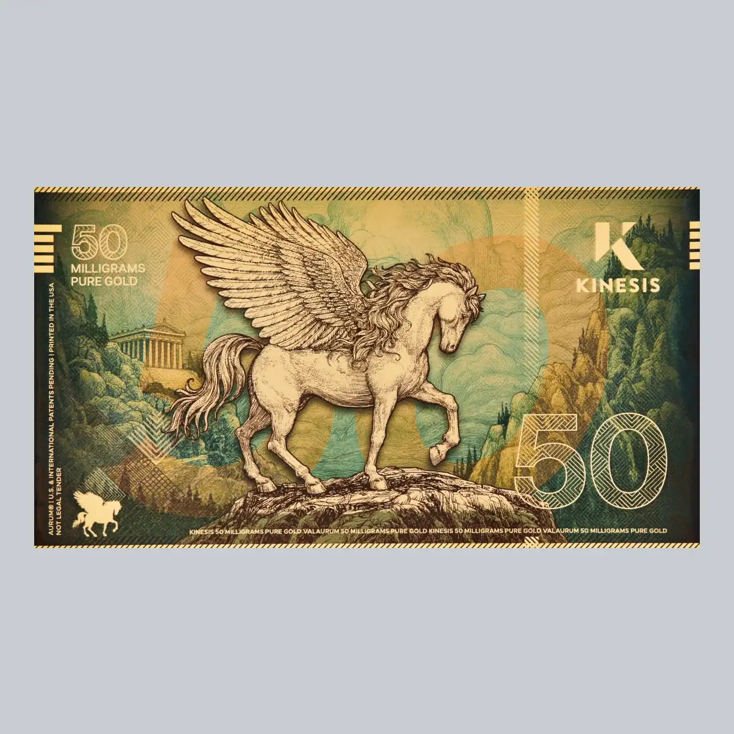 Beautiful 50 mg gold bill featuring the Pegasus embodying freedom, integrity and defiance in the face of a broken monetary system.. Encased in durable polymer for secure, elegant storage.