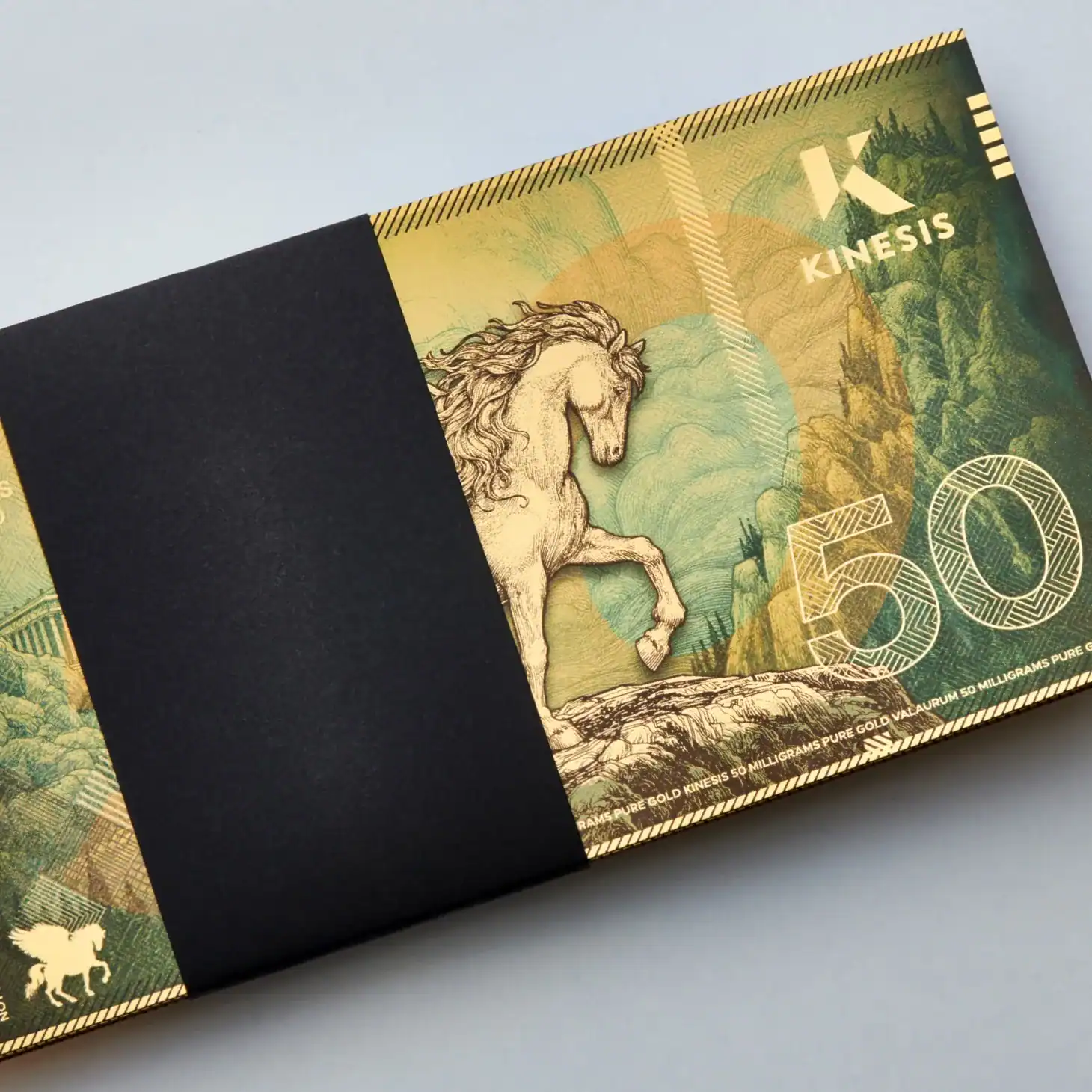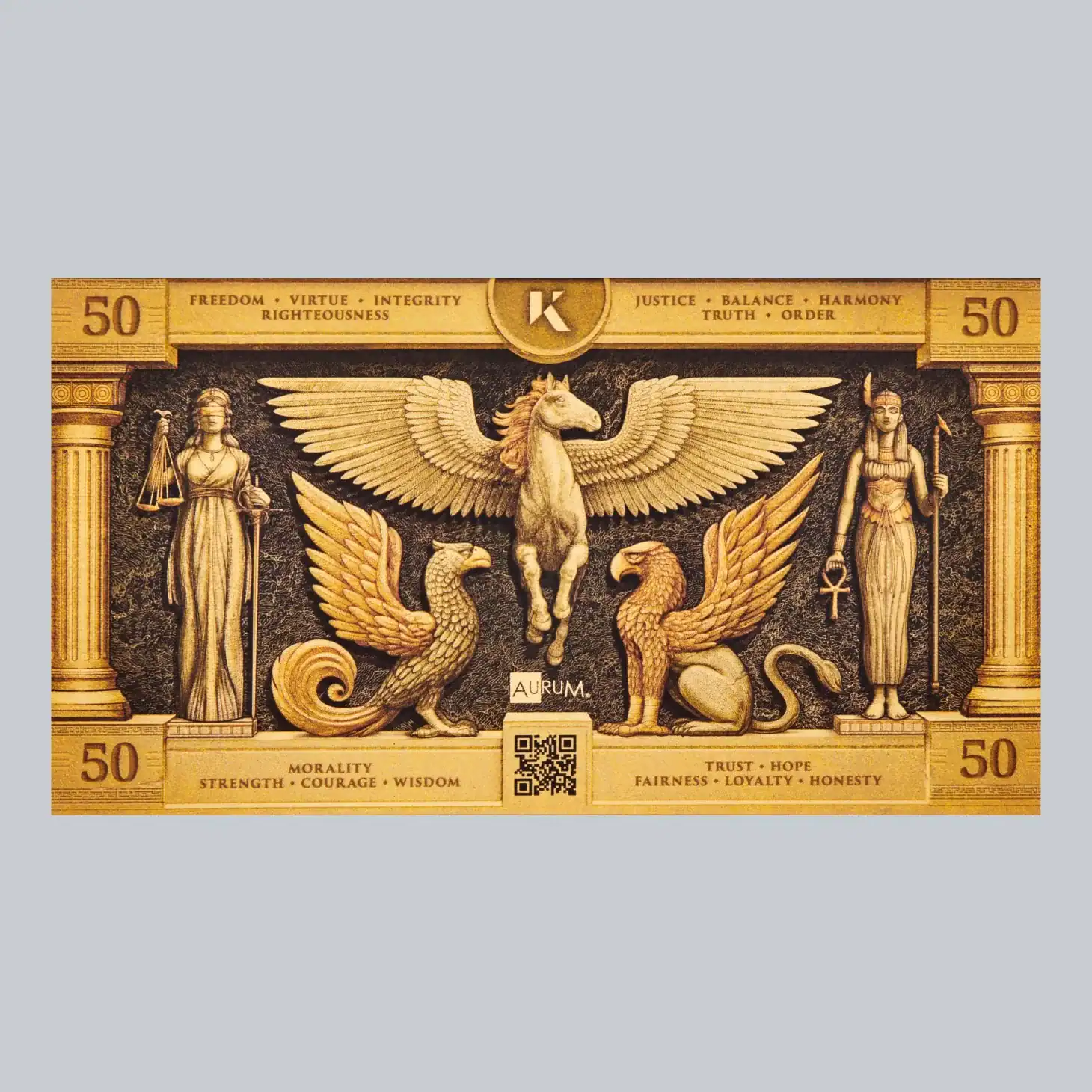 On the reverse side are the five central mythical figures and deities represented throughout the Kinesis Bullion products. The Kinesis and Aurum® logo are shown alongside the QR code leading to our webpage telling the story of Kinesis gold bills.